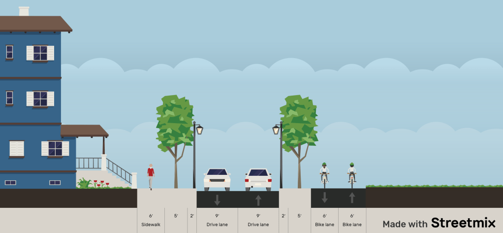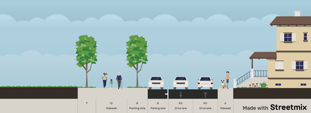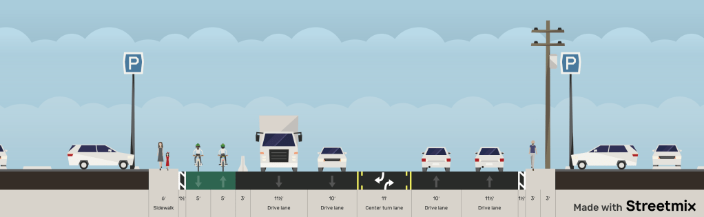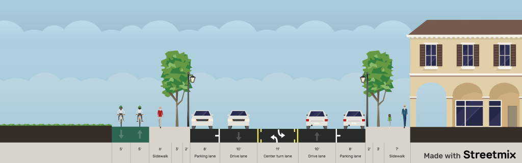 Long term, a streetscape modernization project can elevate the trail, and potentially perform a lane diet. With the trail on the North away from the powerlines, shade trees can be added to protect from the southern sun exposure.