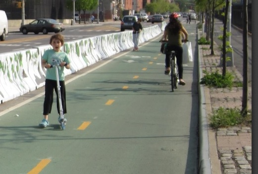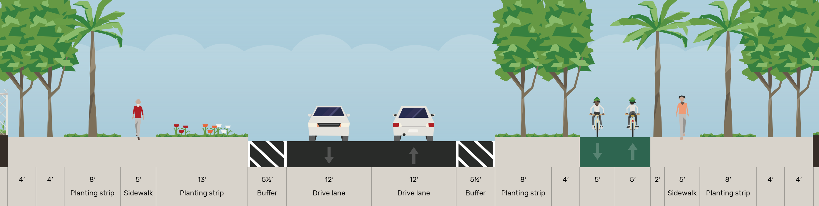 While a lane diet study is conducted for Ocean Ave East of Palm Beach, we propose a quick-build solution of narrowing the lanes and adding a protected multi-directional trail along the North side. This route is continuously used by people walking and biking, but they currently experience unsafe conditions.