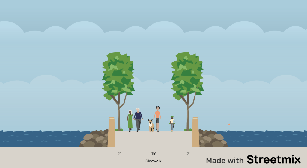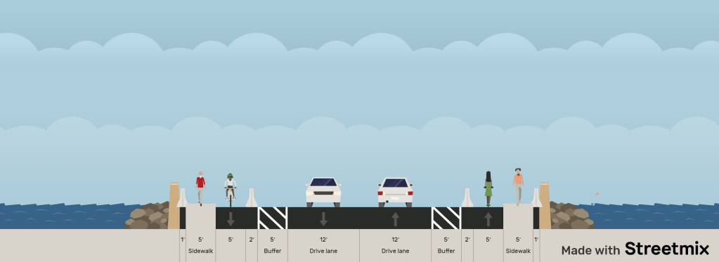 Long term, traffic counts and hurricane evacuation guidance suggest that parts of the bridge could potentially be reduced one lane to allow for signature amenities on top of the bridge (palm trees, shade structures, picnic tables, etc).